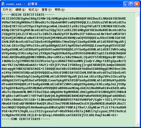 A.分別使用文本編輯工具(如notepad)將root.cer 和CNNIC.cer 分別打開(kāi),分別顯示如下所示