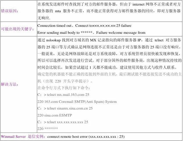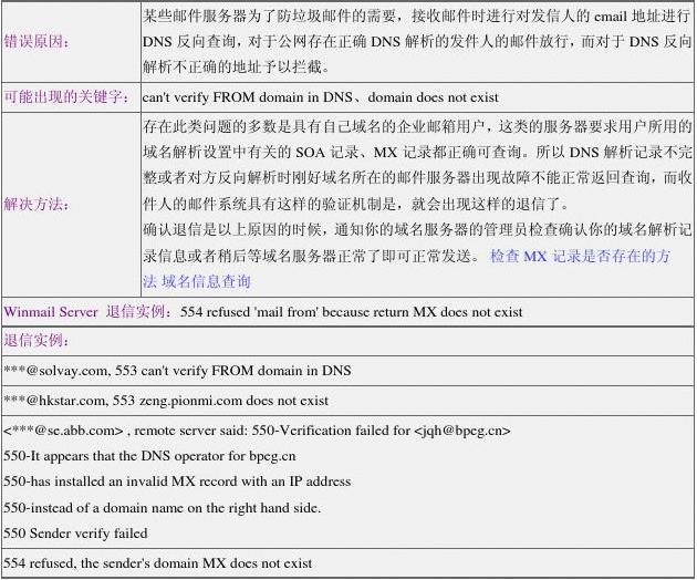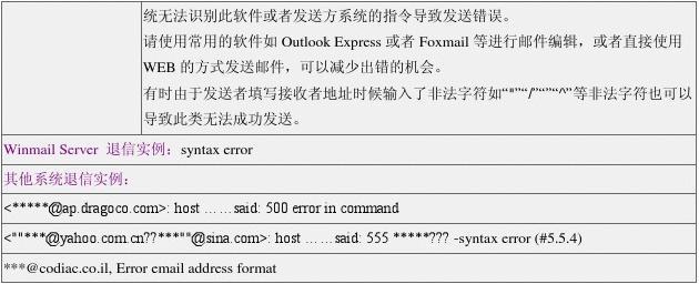 以上是 Winmail Server 產(chǎn)生的錯誤回彈信,由于各個郵件系統(tǒng)的錯誤回彈信表達(dá)方式不同,所以同一個原因可能因郵件系統(tǒng)的不同而有不同的描述。以下是一些常見的退信分析: