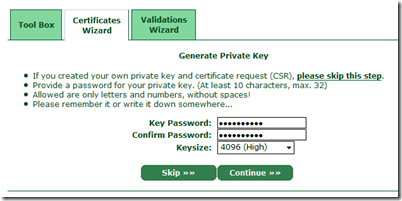 下一步是進(jìn)行private key 產(chǎn)生, 若自行由web server 工具進(jìn)行CSR 匯出時(shí), 可以跳過此步驟, 并由下一步將該CSR 匯入即可, 若是要直接由線上產(chǎn)生, 就自行輸入大于10碼的密碼, 并選好加密強(qiáng)度后進(jìn)行下一步: