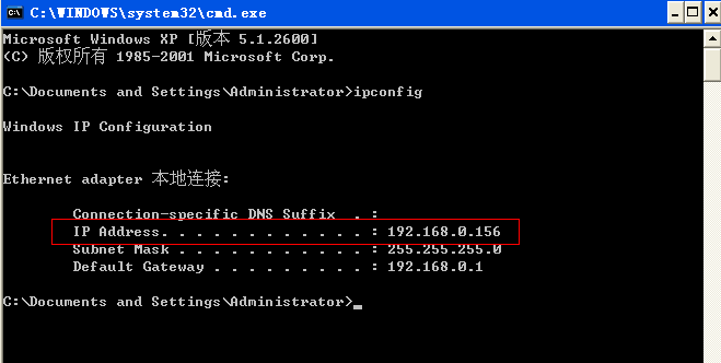 IP 地址的查詢方法:開始——運行——在運行中輸入cmd 點確定后再輸入ipcomfig 再回車就可以看到本機的ip ,如下圖