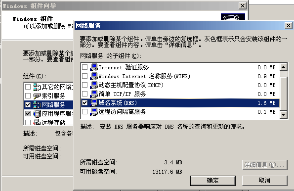 打開控制面板→添加或刪除程序→windos 組建向?qū)Аx擇網(wǎng)絡(luò)服務(wù)→單擊信息詳情→在網(wǎng)絡(luò)服務(wù)窗口中選擇域名系統(tǒng)→單擊確定→之后系統(tǒng)將自動安裝