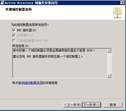 在彈出的窗口中,系統(tǒng)會自動把DNS 勾選,因為是域中的第一臺域控制器,所以默認(rèn)為全局錄服務(wù)器。單擊“下一步”