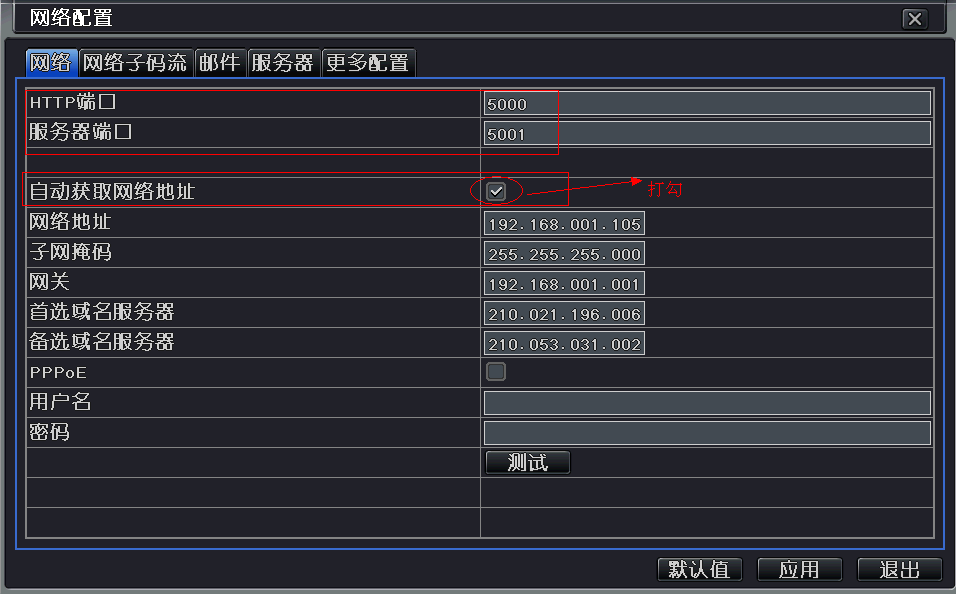 在保證錄像機網(wǎng)線連接正常后進入錄像機網(wǎng)絡(luò)配置,在自動獲取網(wǎng)絡(luò)地址上“打勾”,點應(yīng)用。錄像機會自動獲取一個IP 地址、子網(wǎng)掩碼、網(wǎng)關(guān)、域名服務(wù)器(此功能需要路由器開啟DHCP 功能,假如您的路由器沒有開啟DHCP 功能,此處的IP 地址、子網(wǎng)掩碼、網(wǎng)關(guān)、首選域名服務(wù)器和備選域名服務(wù)器需要您手動設(shè)置)。