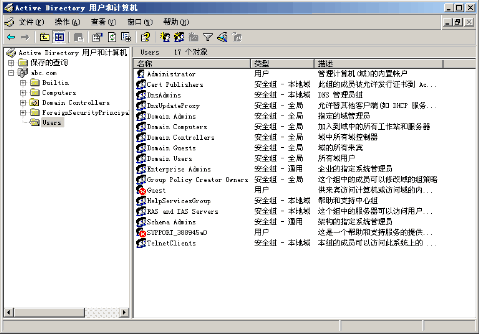 展開后可以找到“users”管理單元,點(diǎn)擊后在右邊就可以看到一些內(nèi)置的用戶帳號(hào)和組。當(dāng)系統(tǒng)安裝了活動(dòng)目錄后,原來(lái)的本地用戶和組帳號(hào)都沒有了,這些對(duì)象會(huì)變成域用戶帳號(hào)和域本地組,并被放在該“users”管理單元內(nèi)
