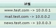 下圖為寫(xiě)好的三條記錄,即將www.test.com 解析為10.0.0.1;將mail.test.com 解析為10.0.0.2;將news.test.com 解析為10.0.0.3