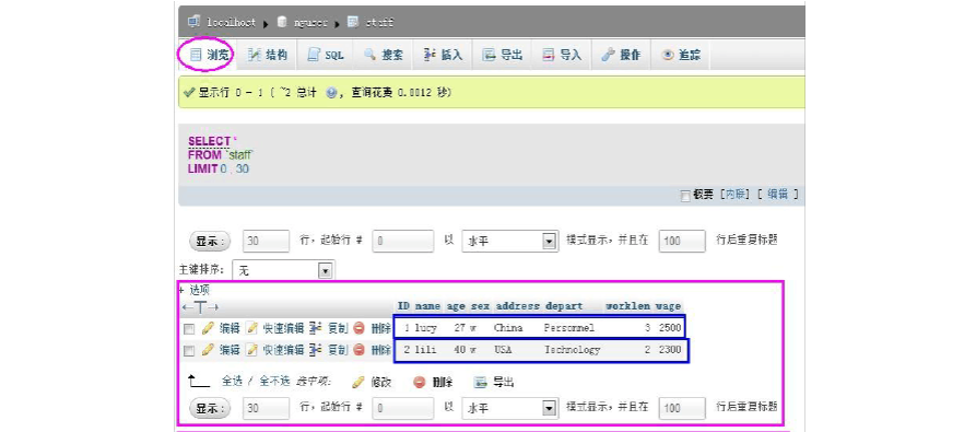實(shí)驗(yàn)內(nèi)容:使用phpMyAdmin 在MySQL 中創(chuàng)建數(shù)據(jù)庫(kù)(myuser ),并添加實(shí)驗(yàn)所需的數(shù)據(jù)(新建staff 表,添加一些記錄);編寫(xiě)Java 程序,利用JDBC 連接在MySQL 中創(chuàng)建好的數(shù)據(jù)庫(kù)(myuser ),對(duì)staff 表格進(jìn)行插入、更新、刪除和查詢(xún)等操作。