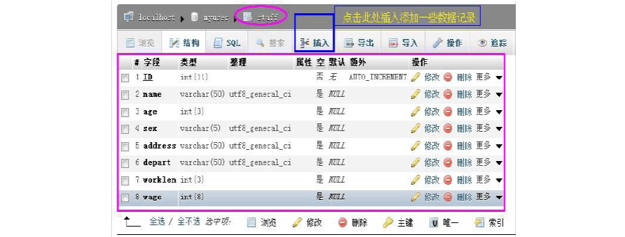 2)新建表格,名稱(chēng)為staff ,表格有8個(gè)字段;