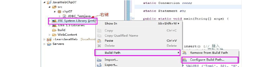 3、在MyEclips 中創(chuàng)建項(xiàng)目并在項(xiàng)目中添加MySQL 驅(qū)動(dòng)程序:創(chuàng)建的項(xiàng)目類(lèi)型可以是 Java項(xiàng)目或者是Java Web 項(xiàng)目都可以。這里創(chuàng)建的是Web 項(xiàng)目,項(xiàng)目名稱(chēng)可以隨便取,我命名為“JavaWebChp07”。創(chuàng)建成功后將步驟1里下載得到的MySQL 驅(qū)動(dòng) 程序包(mysql-connector-java-5.1.18-bin.jar )添加到工程的Build path中,添加過(guò)程如圖所示: