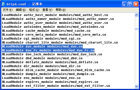 打開D:Apache2.2confhttpd.conf文件,找到: #LoadModule dav_module modules/mod_dav.so , #LoadModule dav_fs_module modules/mod_dav_fs.so 去掉前面的注釋符號#