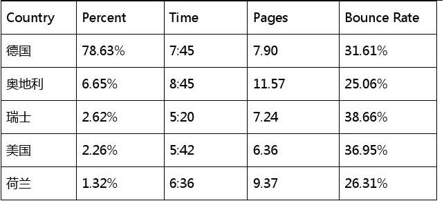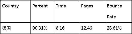 截止到2014年6月,Otto.de 在購物類網(wǎng)站排名第123,用戶訪問量47萬/天,平均停留時間為8:06,平均停留頁數(shù)為12.48,跳出率為29.53。 (2)各國流量占比(2013年7月-2014年6月,前5)