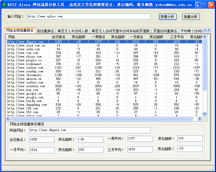 點擊功能性分析下拉列表框中的流量分析選項,打開Rost ?Alexa 網(wǎng)絡流量分析工具,在輸入網(wǎng)址文本框中輸入要進行流量分析的網(wǎng)址,點擊數(shù)據(jù)分析按鈕即可。?