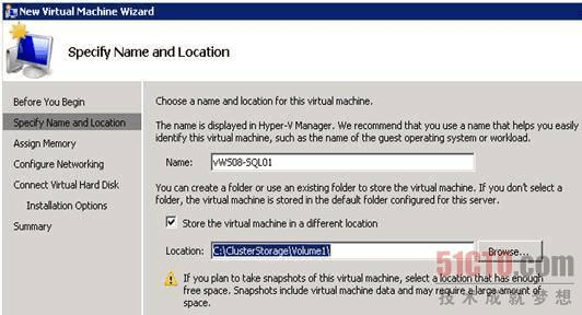 我這里將虛擬機名字命名為vWS08-SQL01,VM 存放位置選擇了C:ClusterStorageVolume1,VM 配置文件也創(chuàng)建在共享存儲上。