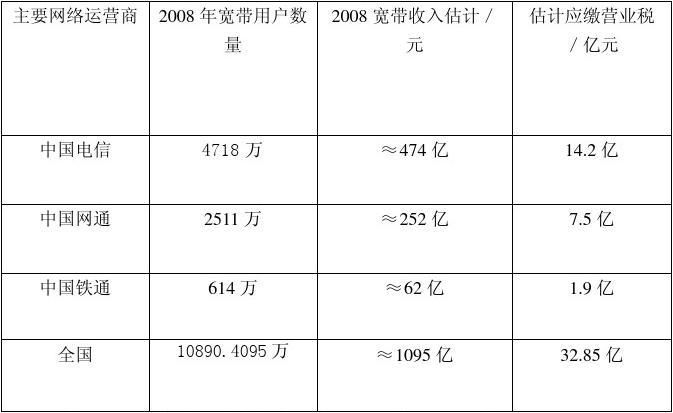 網(wǎng)絡(luò)使用費屬于營業(yè)稅的征稅范圍。根據(jù)《中華人民共和國營業(yè)稅暫行條例 》第一條規(guī)定“在中華人民共和國境內(nèi)提供本條例規(guī)定的勞務(wù)、轉(zhuǎn)讓無形資產(chǎn)或者銷售不動產(chǎn)的單位和個人,為營業(yè)稅的納稅人,應(yīng)當(dāng)依照本條例繳納營業(yè)稅?!倍^應(yīng)稅勞務(wù)是指,建筑業(yè)、交通運輸業(yè)、郵電通訊業(yè)、文化體育業(yè)、金融保險業(yè)、娛樂業(yè)、服務(wù)業(yè)。“網(wǎng)絡(luò)使用費”屬于郵電通信業(yè)。應(yīng)按3%的稅率繳納營業(yè)稅。如表中2008年中國電信的寬帶收入為474億,那么它應(yīng)繳納營業(yè)稅為474×3=14.22億元。