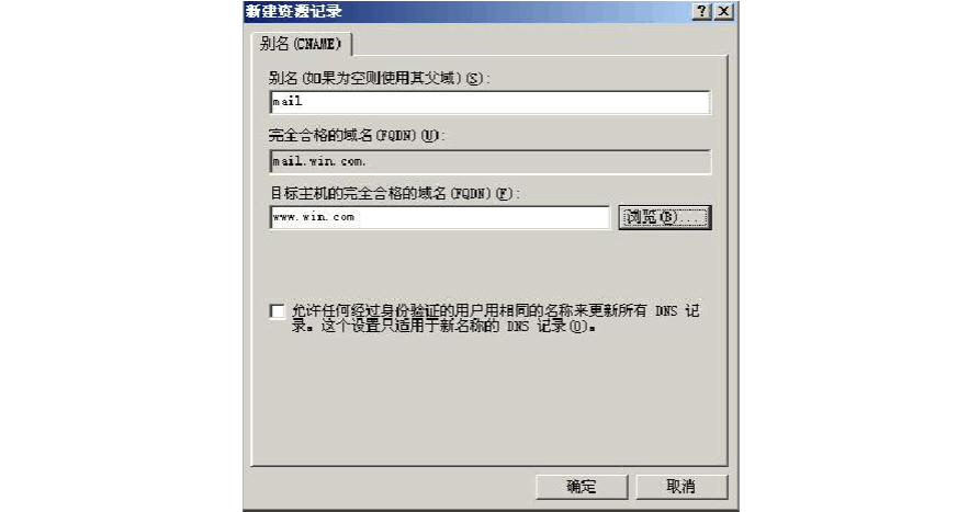 方法一:在左邊樹形目錄里右擊剛建好的主域名win.com ,選擇“新建別名(CNAME )”;如下圖所示,在“別名”欄內(nèi)輸入mail 、FTP 等服務(wù)名;在目標(biāo)主機(jī)的完全合格域名一欄輸入www.win.com 即可。此方法意為其它相關(guān)服務(wù)與WWW 服務(wù)共用192.168.12.101這個IP 地址。