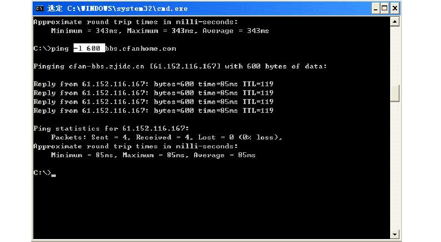 現(xiàn)在以發(fā)送一個(gè)600字節(jié)的數(shù)據(jù)包為例“ping -l 600 bbs.cfanhome.com"