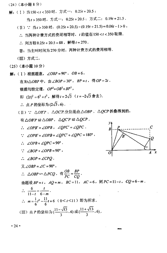 20.已知反比例函數(shù)y =?3x 1>x 3. ?2x -1 (Ⅰ)其圖象與正比例函數(shù)y =x 的圖象的一個交點(diǎn)為P ,若點(diǎn)P 的縱坐標(biāo)是2,求k 的值; (Ⅱ)若在其圖象的每一支上,y 隨x 的增大而減小,求k 的取值范圍; (Ⅲ)若其圖象的一直位于第二象限,在這一支上任取兩點(diǎn)A (x 1, y 1) 、B (x 2, y 2) ,當(dāng)y 1>y 2時,試比較x 1與x 2的大?。?/p> 21.在開展“學(xué)雷鋒社會實(shí)踐”活動中,某校為了解全校1200名學(xué)生參加活動的情況,隨機(jī)調(diào)查了50名學(xué)生每人參加活動的次數(shù),并根據(jù)數(shù)據(jù)繪成條形統(tǒng)計圖如圖. (Ⅰ)求這50個樣本數(shù)據(jù)的平均數(shù)、眾數(shù)和中位數(shù); (Ⅱ)根據(jù)樣本數(shù)據(jù),估算該校1200名學(xué)生共參加了多少次活動? 22.已知⊙O 中,AC 為直徑,MA 、MB 分 3頁 別切⊙O 于點(diǎn)A 、B . (Ⅰ)如圖①,若∠BAC=25°,求∠AMB 的大?。?/p> (Ⅱ)如圖②,過點(diǎn)B 作BD ⊥AC 于E ,交⊙O 于點(diǎn)D ,若BD=MA,求∠AMB 的大?。?/p> 23.如圖,甲樓AB 的高度為123m ,自甲樓樓頂A 處,測得乙樓頂端C 處的仰角為45°,測得乙樓底部D 處的俯角為30°,求乙樓CD 的高度(結(jié)果精確到0.1m 1.73). 題: (Ⅰ)用含有t 的式子填寫下表: (Ⅱ)當(dāng)t 為何值時,兩種計費(fèi)方式的費(fèi)用相等? 4頁 (Ⅲ)當(dāng)330<t <360時,你認(rèn)為選用哪種計費(fèi)方式省錢(直接寫出結(jié)果即可) 25.已知一個矩形紙片OACB ,將該紙片放置在平面直角坐標(biāo)洗中,點(diǎn)A (11,0),點(diǎn)B (0, 6),點(diǎn)P 為BC 邊上的動點(diǎn)(點(diǎn)P 不與點(diǎn)B 、C 重合),經(jīng)過點(diǎn)O 、P 折疊該紙片,得點(diǎn)B ′和折痕OP .設(shè)BP=t. (Ⅰ)如圖①,當(dāng)∠BOP=30°時,求點(diǎn)P 的坐標(biāo); (Ⅱ)如圖②,經(jīng)過點(diǎn)P 再次折疊紙片,使點(diǎn)C 落在直線PB ′上,得點(diǎn)C ′和折痕PQ ,若AQ=m,試用含有t 的式子表示m ; (Ⅲ)在(Ⅱ)的條件下,當(dāng)點(diǎn)C ′恰好落在邊OA 上時,求點(diǎn)P 的坐標(biāo)(直接寫出結(jié)果即可). 26.已知拋物線y =ax 2 bx c (0<2a (Ⅰ)當(dāng)a=1,b=4,c=10時, ①求頂點(diǎn)P 的坐標(biāo); ②求y A 的值; y B -y C y A 的最小值. y B -y C (Ⅱ)當(dāng)y 0≥0恒成立時,求 5頁 6頁 7頁 8頁 9頁 10頁