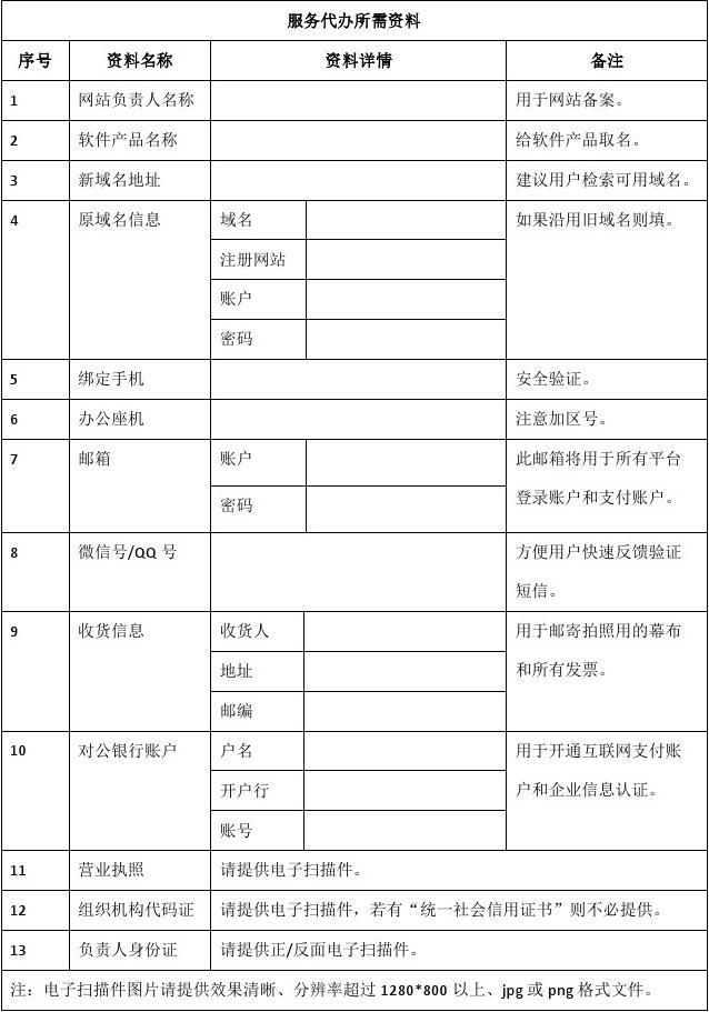 辦理過程中服務(wù)代辦人員請需按下面模板記錄好各平臺賬戶和其他重要信息,各平臺具體操作方式詳見各平臺幫助中心或咨詢客服: