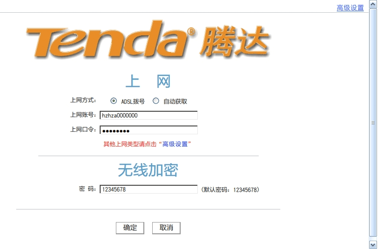 登錄成功后提示輸入上網(wǎng)帳號和密碼,如果已經(jīng)配置過了,不需要進入,直接點擊右上角的【高級設(shè)置】,進入配置界面,如下圖: