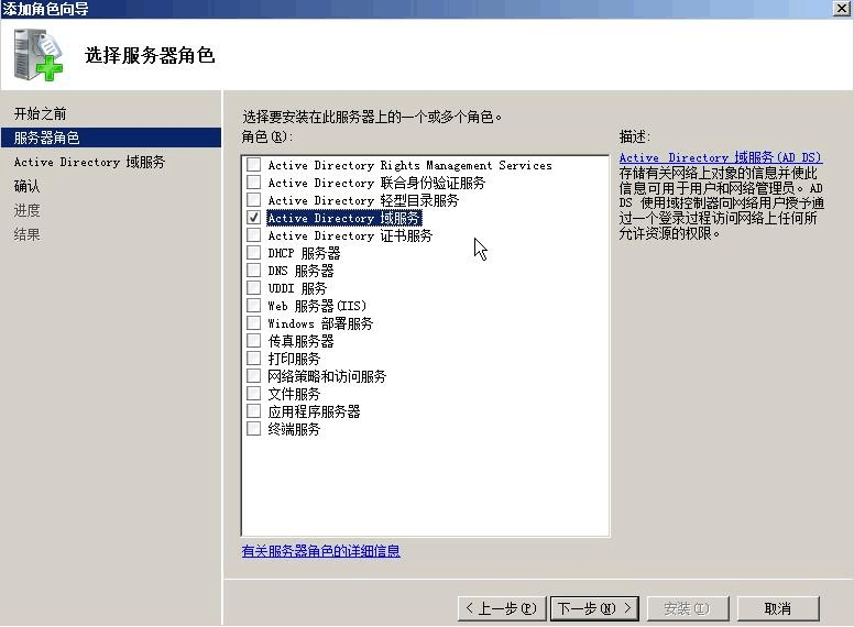 在服務(wù)器角色中選擇AD 域服務(wù)(DNS 不可與AD 一起勾選)