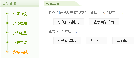 點(diǎn)擊繼續(xù)進(jìn)行DedeCMS 的安裝,過(guò)一小會(huì)就會(huì)提示你安裝成功了。你可以進(jìn)入網(wǎng)站首頁(yè)和登陸網(wǎng)站后臺(tái)了。