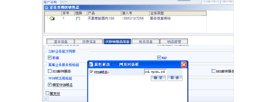 查詢出要修改的手機(jī)用戶資料后,選擇“服務(wù)信息變動(dòng)”業(yè)務(wù),將關(guān)聯(lián)銷售品中“綁定VPDN 域名”的屬性值直接改為新的域名即可。