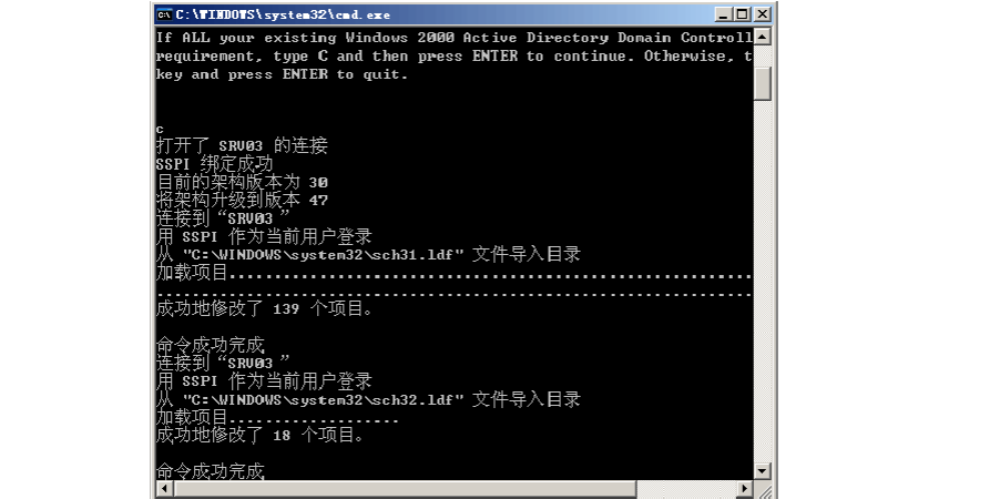 ,輸入adprep32.exe /forestprep 進(jìn)行2003 Schema 林架構(gòu)升級。