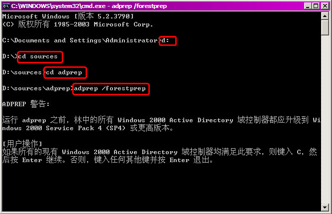 首先把windows server 2008的系統(tǒng)盤放入到windows 2003光驅中,打開命令提示符對話框,輸入d:回車----cd sources 回車-----cd adprep 回車-------adprep /forestprep 然后按C 鍵,回車。