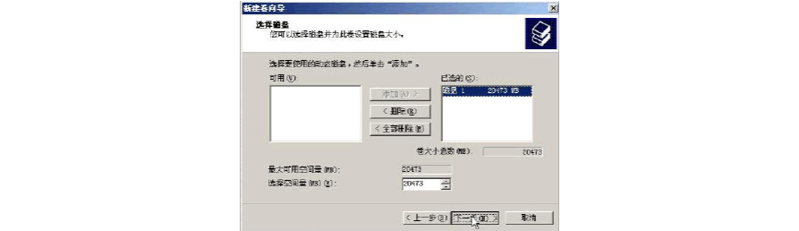 20. 這里我們只有一塊可用磁盤,默認(rèn)已經(jīng)被放到“已選的”一欄,建議使用最大可用空間,默認(rèn),下一步