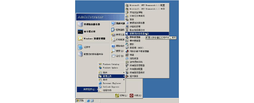 1. 首先打開“開始”中“所有程序”,在其“管理工具”中找到“配置您的服務(wù)器向?qū)А?,向?qū)е胁粌H僅可以配置AD 域,還有其他服務(wù)可以在此安裝(見圖5),接下來便可以按照向?qū)б徊讲桨惭bAD 域了。
