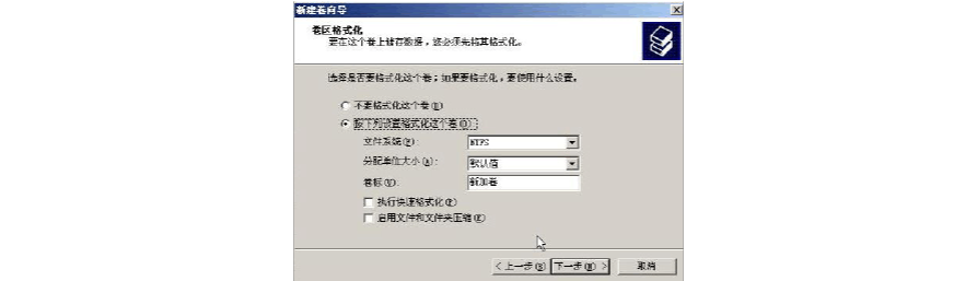 22. 要想使新建的卷區(qū)可以使用,必須將其格式化,你可以自由選擇“文件系統(tǒng)”、“分配單位大小”和“卷標(biāo)”(默認(rèn)即可,強(qiáng)烈建議保留文件系統(tǒng)為NTFS 格式),另外還可以選擇格式化方式,一般的,我們可以選擇“快速格式化”以節(jié)約時(shí)間。
