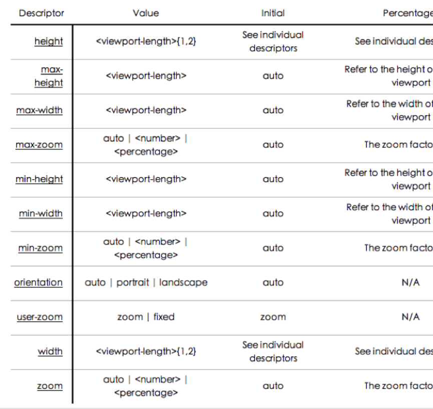 w3c 草案中@viewport 支持以下屬性