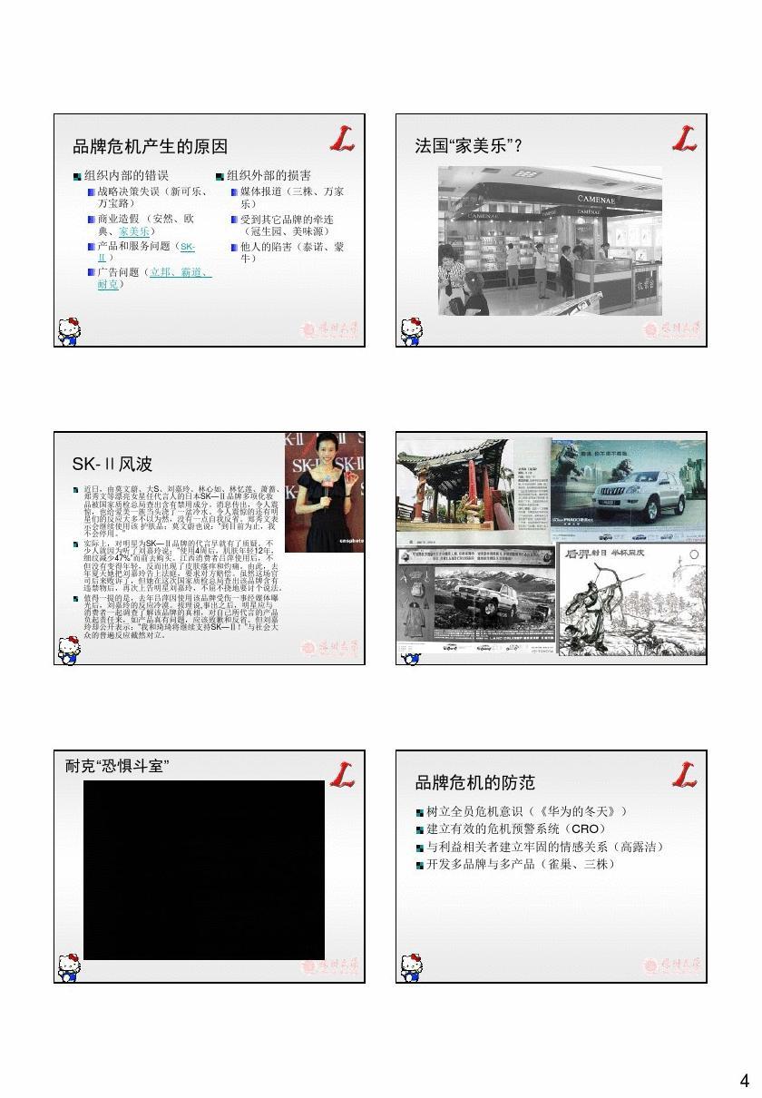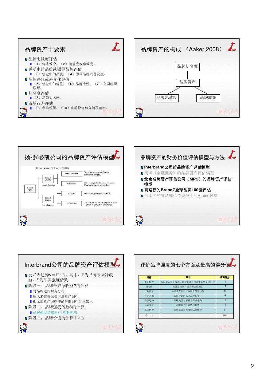 第8章 品牌資產(chǎn)評(píng)估與保護(hù)n品牌資產(chǎn)的定義 品牌價(jià)值鏈 品牌資產(chǎn)評(píng)估模型與方法 品牌危機(jī)產(chǎn)生的原因 品牌危機(jī)的防范 品牌危機(jī)管理的原則 品牌危機(jī)公關(guān) 品牌侵權(quán)、搶注與保護(hù)nn品牌資產(chǎn)的概念背景n20世紀(jì)80年代末起,品牌資產(chǎn)受到廣泛關(guān)注 美國(guó)廣告學(xué)者威廉·韋爾斯(William D. Wells)針 對(duì)當(dāng)前品牌資產(chǎn)研究領(lǐng)域的這種現(xiàn)象明確指出: “對(duì)品牌資產(chǎn)的研究好似盲人摸象,不同的人出于 不同的目的和受個(gè)人背景的局限,賦予其不同的 含義及采用不同的評(píng)估方法?!?品牌資產(chǎn)的英文表述目前有Brand Equity、Brand Asset、Brand Value等,中文翻譯有“品牌資產(chǎn)”、 “品牌權(quán)益”、“品牌價(jià)值”、“品牌產(chǎn)權(quán)”等不一。本 書采用Brand Equity以及“品牌資產(chǎn)”的中文譯名nn品牌資產(chǎn)的定義n產(chǎn)出視角的品牌資產(chǎn)定義(財(cái)務(wù)視角)nShocker & Weitz(1988)指出,品牌資產(chǎn)是有品牌產(chǎn)品與無(wú)品牌產(chǎn)品之間 的現(xiàn)金流量差額; Mullen & Mainz(1989)認(rèn)為,品牌資產(chǎn)是高于一般競(jìng)爭(zhēng)者價(jià)格的附加值。 芝加哥大學(xué)的西蒙(Simon)和沙利文(Sullivan)根據(jù)公司未來現(xiàn)金流 量折現(xiàn)的遞增量定義品牌資產(chǎn)nn品牌價(jià)值鏈(Brand Value Chain,Keller,2003)n價(jià)值階段nn營(yíng)銷活動(dòng)投入nn顧客心智nn市場(chǎng)業(yè)績(jī)nn股東價(jià)值nn來源視角的品牌資產(chǎn)定義(消費(fèi)者視角)nKeller(1993)從消費(fèi)者的角度來定義,認(rèn)為品牌資產(chǎn)是品牌通過營(yíng)銷傳播 而使消費(fèi)者在品牌知識(shí)上反映出來的差異化效應(yīng)。nn綜合視角的品牌資產(chǎn)定義(綜合視角)nPeter Farquhar認(rèn)為,品牌資產(chǎn)是品牌給產(chǎn)品帶來的超越其使用價(jià)值的附 加價(jià)值或附加利益 Aaker(1991)認(rèn)為,品牌資產(chǎn)是一組與一個(gè)品牌的名字及符號(hào)相關(guān)的資產(chǎn) 和負(fù)債,它能增加或扣減某產(chǎn)品或服務(wù)所帶給該企業(yè)或顧客的價(jià)值; Srivastava(1991)認(rèn)為品牌資產(chǎn)包括品牌強(qiáng)度和品牌價(jià)值。 MSI(1988)認(rèn)為,品牌資產(chǎn)是品牌的客戶、配銷商、和公司本部各方面的 聯(lián)想與行為的集合,它容許品牌的使用比不用品牌時(shí),贏得更多的銷售 量和更大的邊際利潤(rùn),它給予品牌一個(gè)強(qiáng)烈的、可持續(xù)的、以及差異化 的優(yōu)勢(shì)以壓制競(jìng)爭(zhēng)者。nn營(yíng)銷質(zhì)量nn市場(chǎng)條件nn投資效益nn品牌資產(chǎn)的指標(biāo)分值評(píng)估模型與方法n阿克的品牌資產(chǎn)五星模型及十要素評(píng)估法 凱勒的基于顧客的品牌資產(chǎn)金字塔模型 艾略特和佩西的品牌資產(chǎn)合成模型 揚(yáng)-羅必凱公司的品牌資產(chǎn)評(píng)估模型 國(guó)際市場(chǎng)研究公司的品牌資產(chǎn)引擎模型 全方位研究公司的品牌資產(chǎn)趨勢(shì)法 奧美的品牌資產(chǎn)組合模型nn品牌資產(chǎn)五星模型(David Aaker)n品牌忠誠(chéng)度 Brand Loyaltynn其他資產(chǎn) Other Assetsnn品牌知名度 Brand Awarenessnn品牌資產(chǎn)nn品牌聯(lián)想 Brand Associationnn感知質(zhì)量 Perceived Qualitynn1nn