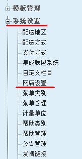 1. 進(jìn)入主站后臺(tái)管理,操作左邊樹形菜單選擇" 系統(tǒng)設(shè)置"->"網(wǎng)店設(shè)置" :