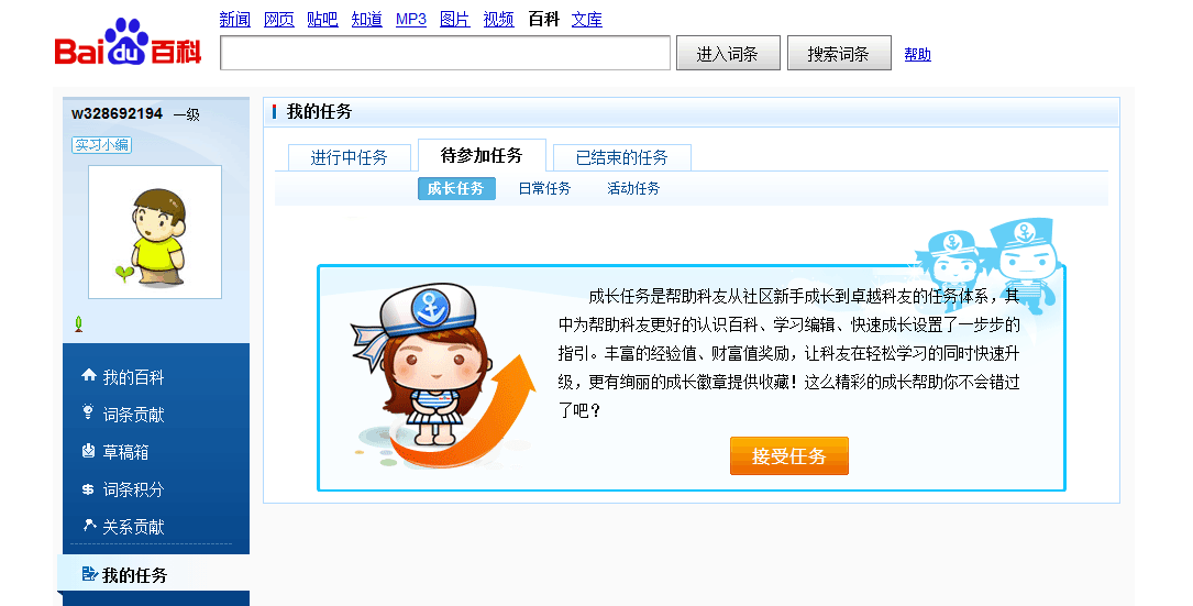 怎么升到四級(jí)呢?先要去百科里做任務(wù),點(diǎn)成長任務(wù)下面的" 我要去參加 ", 再點(diǎn)接受任務(wù) 按指示去做升級(jí),當(dāng)?shù)搅硕?jí)的時(shí)候,自己編寫詞條來積分,必須要編寫300個(gè)詞條才能升到四級(jí)。