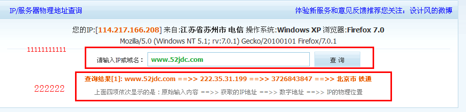 地址 如www.52jdc.com 111111:是填寫需要查詢網(wǎng)站地址 22222:是網(wǎng)站ip 地址在哪里的