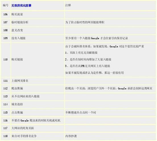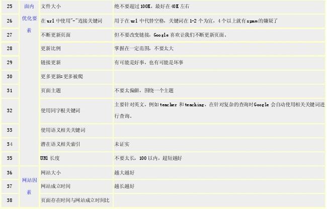 文中提到的因素排名不分先后,這些因素并不一定可行,僅僅是提供了一些可能,是否確實可行需要大家自己驗證,優(yōu)化中的一些具體細節(jié)需要大家自己把握。下文中綠色底色條目為Google patent已經(jīng)證實可行的方法。