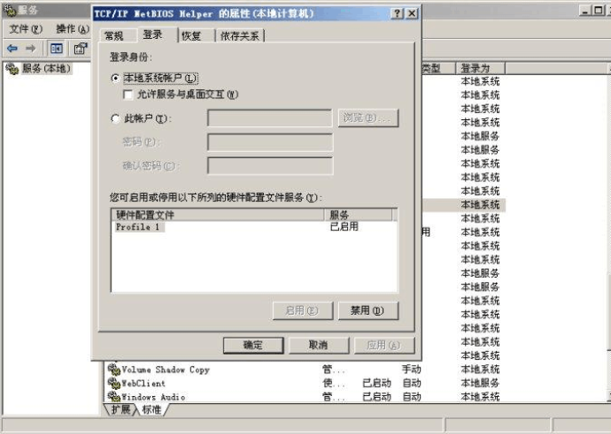 l 在“登陸”列表中,單擊“此帳戶(hù)”,輸入“NT AUTHORITY LocalService”,空密碼;