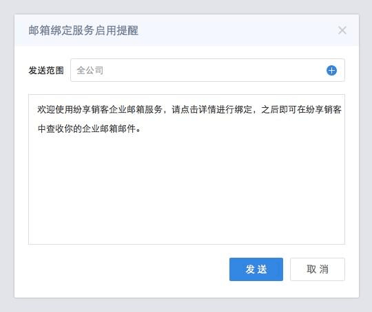 管理員在Web 端開通了企業(yè)郵箱綁定服務(wù)后,還需要發(fā)消息到紛享銷客客戶端,以知會(huì)員工綁定自己的郵箱賬戶。