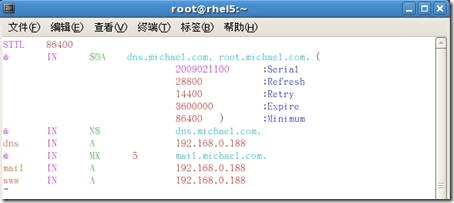2)建立michael.com 區(qū)域文件 vim /var/named/michael.com