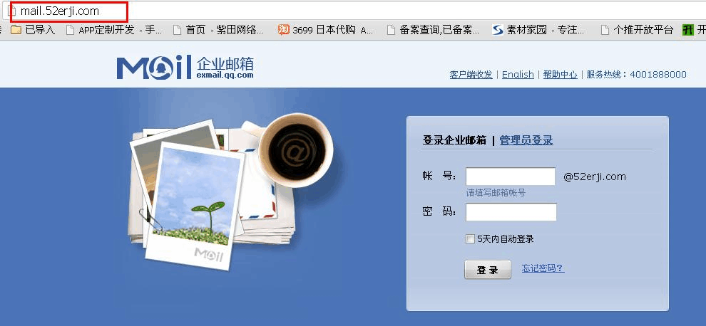 ,有提示(每個(gè)郵箱賬戶都要手動(dòng)設(shè)置綁定QQ 號(hào)才可以聯(lián)通QQ 郵箱)。現(xiàn)在還有個(gè)問題就是,每次登錄企業(yè)郵箱的時(shí)候都是要輸入網(wǎng)址 https://exmail.qq.com/login 很麻煩,現(xiàn)在我們要做一個(gè)類似于http://mail.52erji.com 這樣的域名解析操作,一會(huì)我們只需要輸入 mail. 域名.com 或者 mail. 域名.net 或者其他域名后綴 就可以打開企業(yè)郵箱登錄地址了。