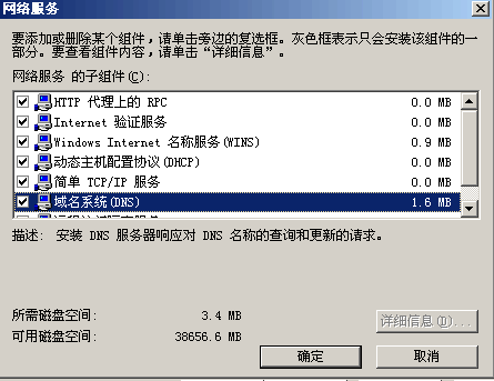 打開“網(wǎng)絡服務”對話框。選中“域名系統(tǒng)”復選框,單擊“確定”按鈕。進行安裝;