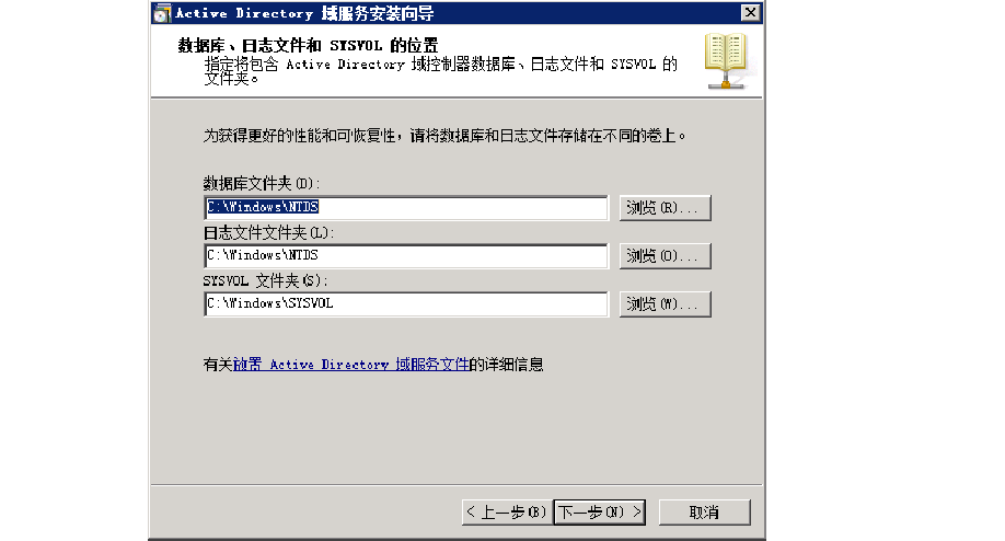 在“數(shù)據(jù)庫、日志文件和SYSVOL 的位置”頁面,點“下一步”。