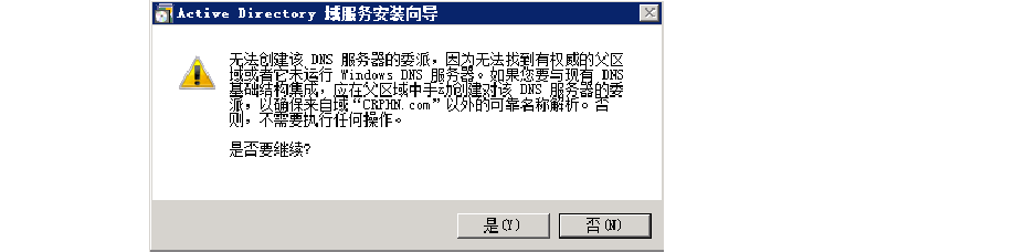 由于這是新林中的第一個域的DNS 服務器,所以無法創(chuàng)建DNS 服務器的委派。在出現(xiàn)的詢問頁面中,點“是”繼續(xù)安裝。