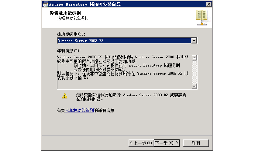 在“設置林功能級別”頁面,選擇林功能級別為“Windows Server 2008 R2”,然后點“下一步”。