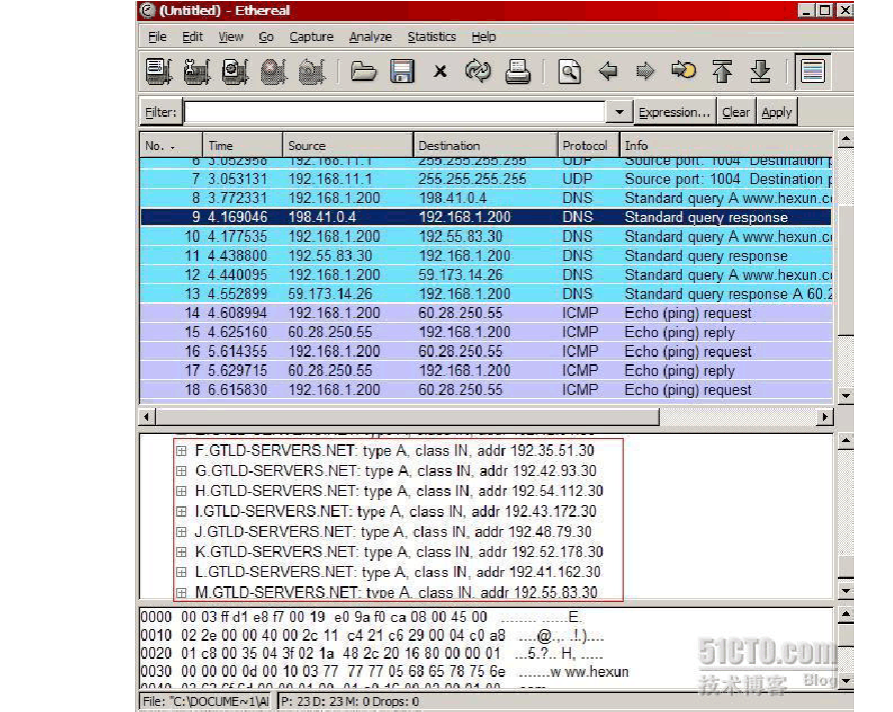 打開抓包工具Ethereal ,如下圖所示,我們看到第8條記錄顯示DNS 服務(wù)器Berlin 向198.41.0.4發(fā)出了一個查詢請求,請求解析