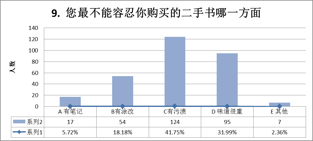 而圖3-3-5可以看出同學(xué)們最關(guān)注的二手書情況不能有污漬、不能有味道、不能有涂改、給將來(lái)做網(wǎng)站做一個(gè)參考。