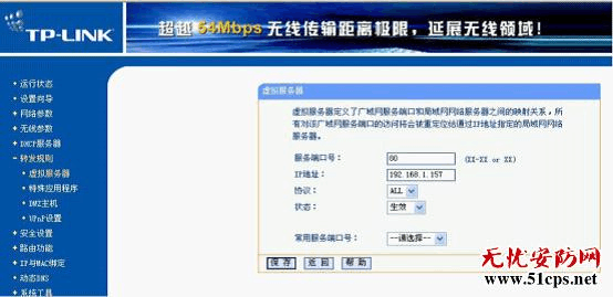 (5)在右邊服務(wù)端口號中填“80”,IP 地址中填“192.168.1.157”,協(xié)議選擇“ALL”,狀態(tài)為“生效”,常用服務(wù)器端口號保持默認(rèn),點(diǎn)擊保存。