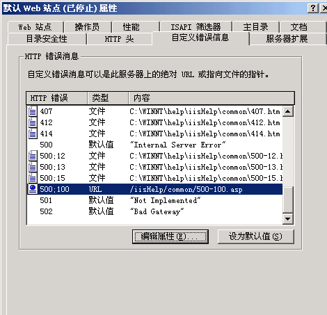 在彈出的對(duì)應(yīng)標(biāo)簽頁(yè)面中,找到"HTTP 錯(cuò)誤消息" 列表中的"500:100"選項(xiàng)(如圖5所示),再單擊一下該頁(yè)面中的" 編輯屬性" 按鈕,這樣系統(tǒng)將自動(dòng)彈出錯(cuò)誤映射屬性設(shè)置窗口;