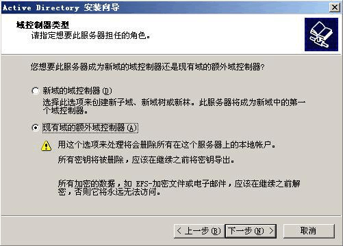 5、這里由于是安裝第二臺域控制器,所以選擇【現(xiàn)有域的額外域控制器】,點下一步6、這里輸入你的域管理員的用戶名和密碼,點下一步。如圖:7、 這里提示你的這臺域控制將成為哪個域的額外域控制器,如果正確,點下一步,再連續(xù)點三個下一步,就開始安裝了8、幾分鐘后安裝完成,提示重新啟動計算機,重新啟動計算機,此時你的計算機已經(jīng)成為了yanqing.com 域的輔助域控制了。此時在活動目錄