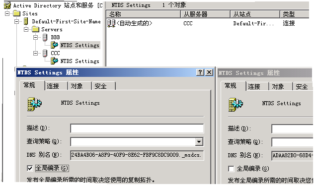15、角色轉(zhuǎn)移成功以后,還要把GC 也轉(zhuǎn)移過去,打開活動目錄站點和服務,展開site->default-first-site-name->servers,你會看到兩臺域控制器都在下面。展開ccc ,右擊【NTDS Settings】點【屬性】,勾上全局編錄前面的勾,點確定,然后展開bbb ,右擊【NTDS Settings 】點【屬性】,去掉全局編錄前面的勾。如圖:這樣全局編錄也轉(zhuǎn)到ccc 上去了,致此主域控制器已經(jīng)變成ccc